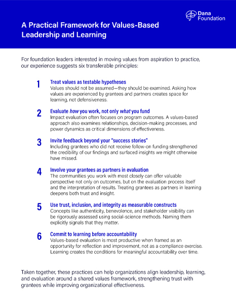 When values are lived, tested, and refined in partnership with others, they become more than principles. They become a source of trust, learning, and shared progress. We share this approach as a case study of a practical, values-based framework for other foundation leaders seeking to strengthen trust, accountability, and impact in their own work.